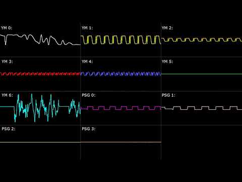 - YM2612 - 6 canali (generalmente tutti utilizzati; solo FM synth senza sample -PCM non usato-) - parte alta dell'oscilloscopio (N.B.: i tracciati sono mostrati a coppie per rendere gli effetti stereo);